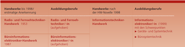 Im Rahmen der Handwerksnovelle 1998 wurden die Handwerke Radio- und Fernsehtechniker und Büroinformationselektroniker zum neuen Informationstechniker-Handwerk mit den Schwerpunkten Geräte- und Systemtechnik sowie Bürosystemtechnik zusammengeführt.